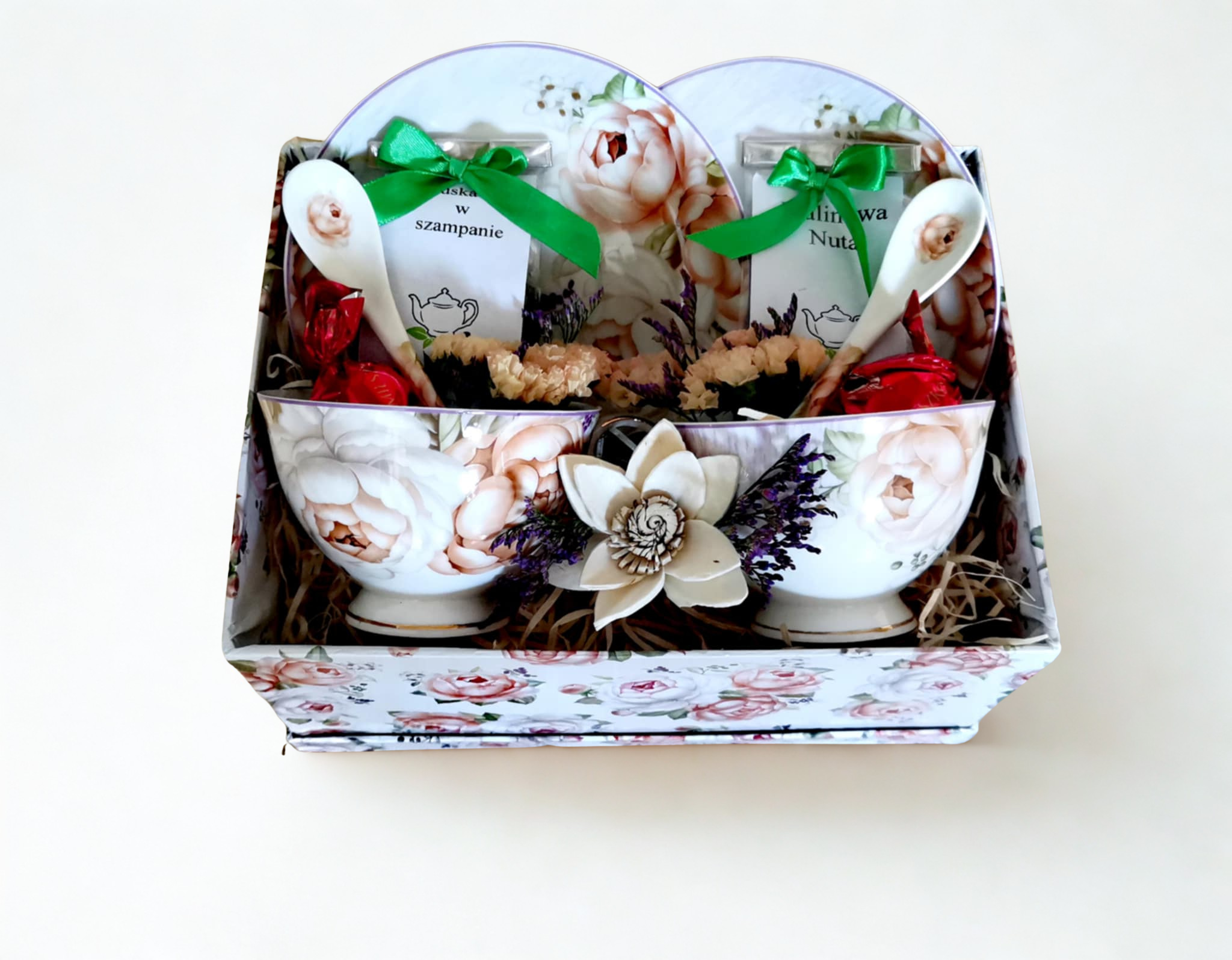 Zestaw prezentowy a w środku znajdziemy pierniki o smaku pomarańczowym, cztery wysokiej jakości herbaty, aromatyczna kawa, cytryny w syropie, rzemieślnicza czekolada z orzechami laskowymi oraz syrop z głogu. Zestaw estetycznie zapakowany, prezent gotowy do wręczenia.