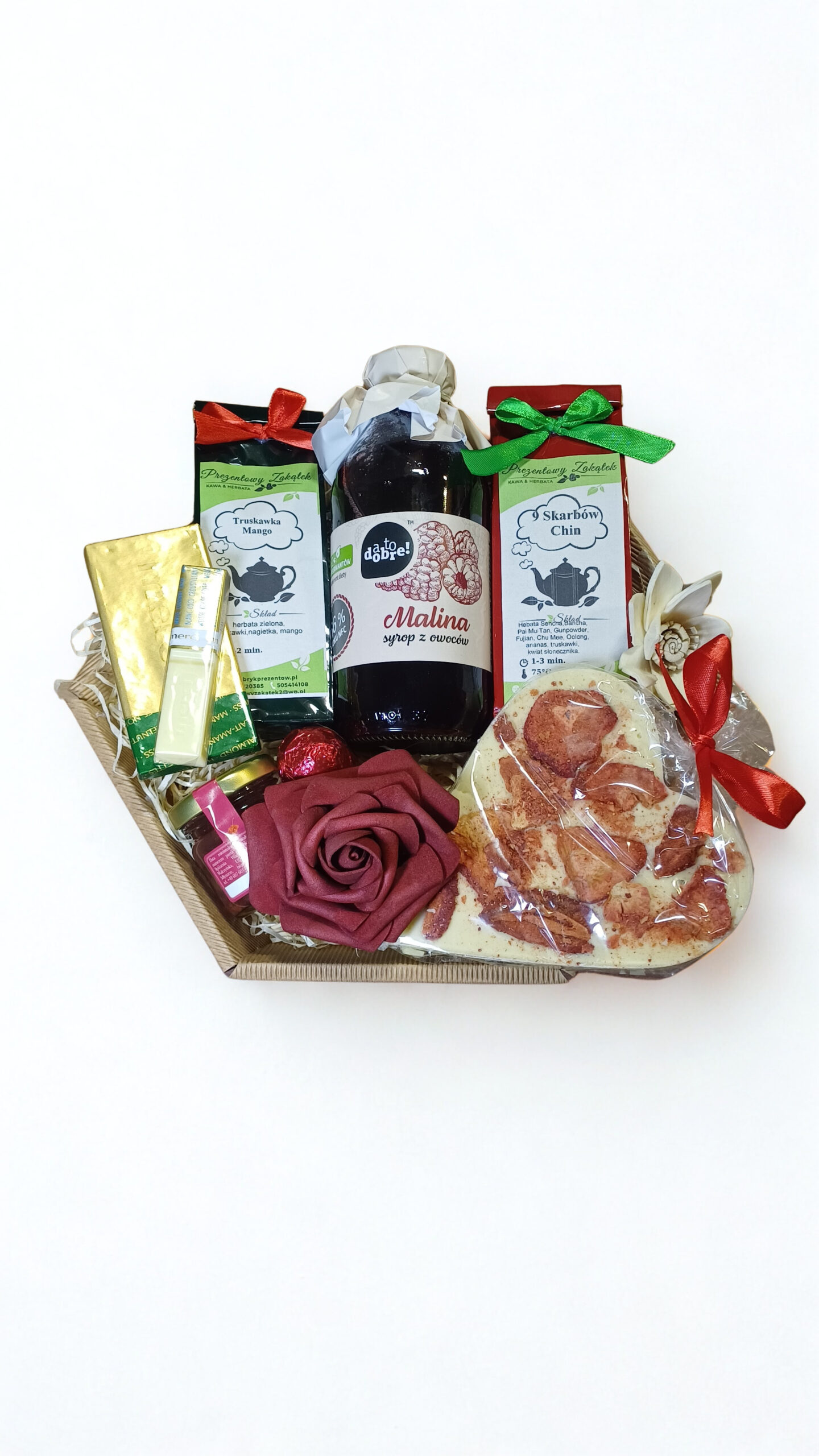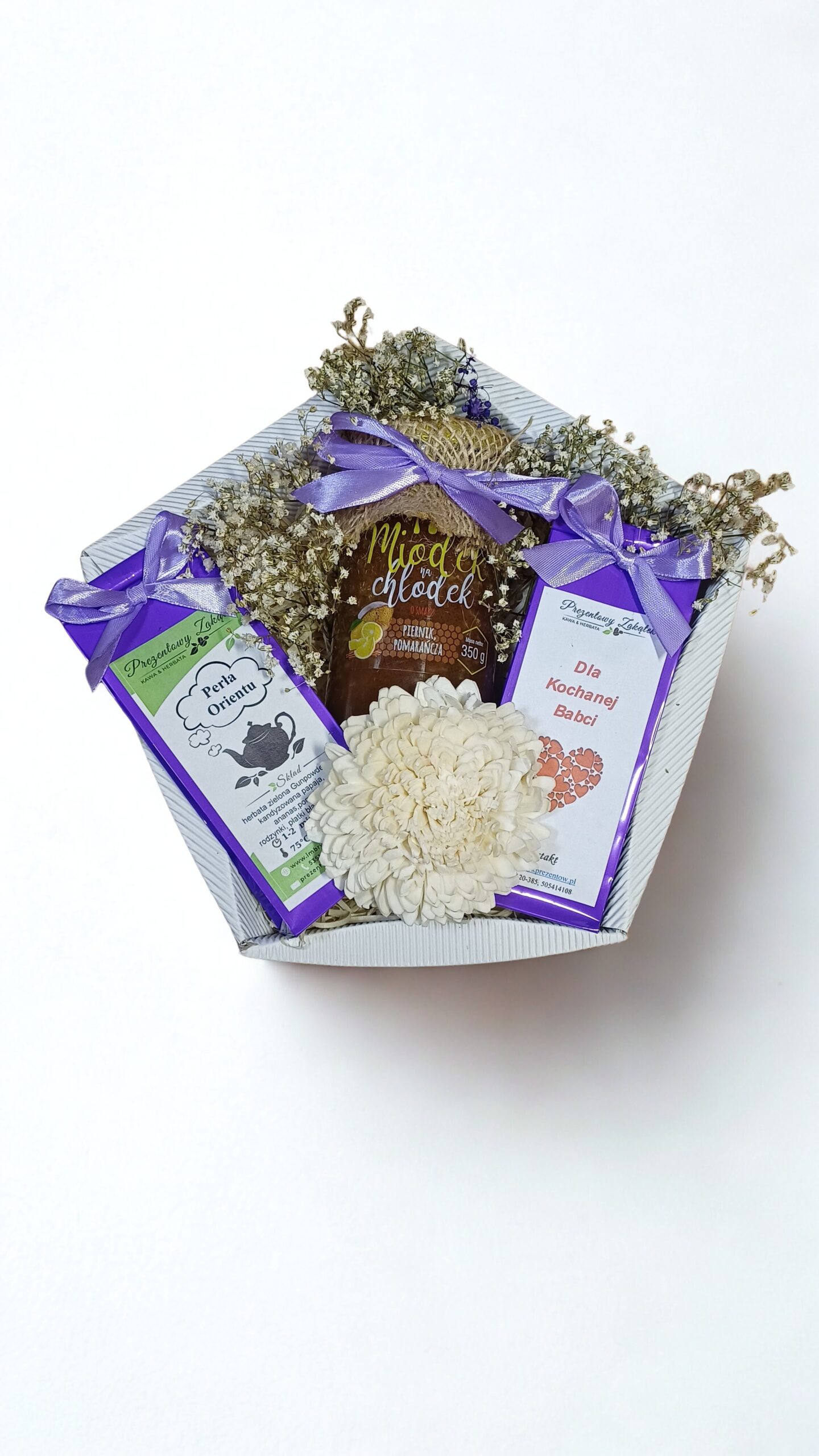 Zestaw herbaciany z pysznym piernikowym miodem. Z uroczymi, kwiatowymi dekoracjami. Gotowy do wręczenia dla kogoś bliskiego