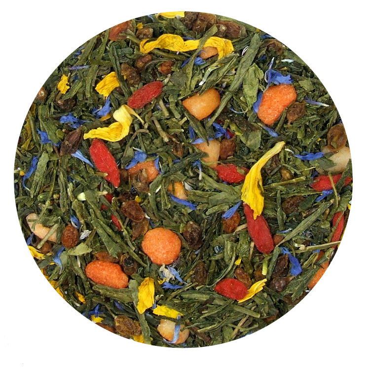 Herbata o aromacie malin i leśnych jagód. Czerwone akcenty kruszonych malin doskonale łączą się z biało różowymi, cukrowymi serduszkami, a pomarańczowe niteczki dzikiego szafranu dopełniają całość