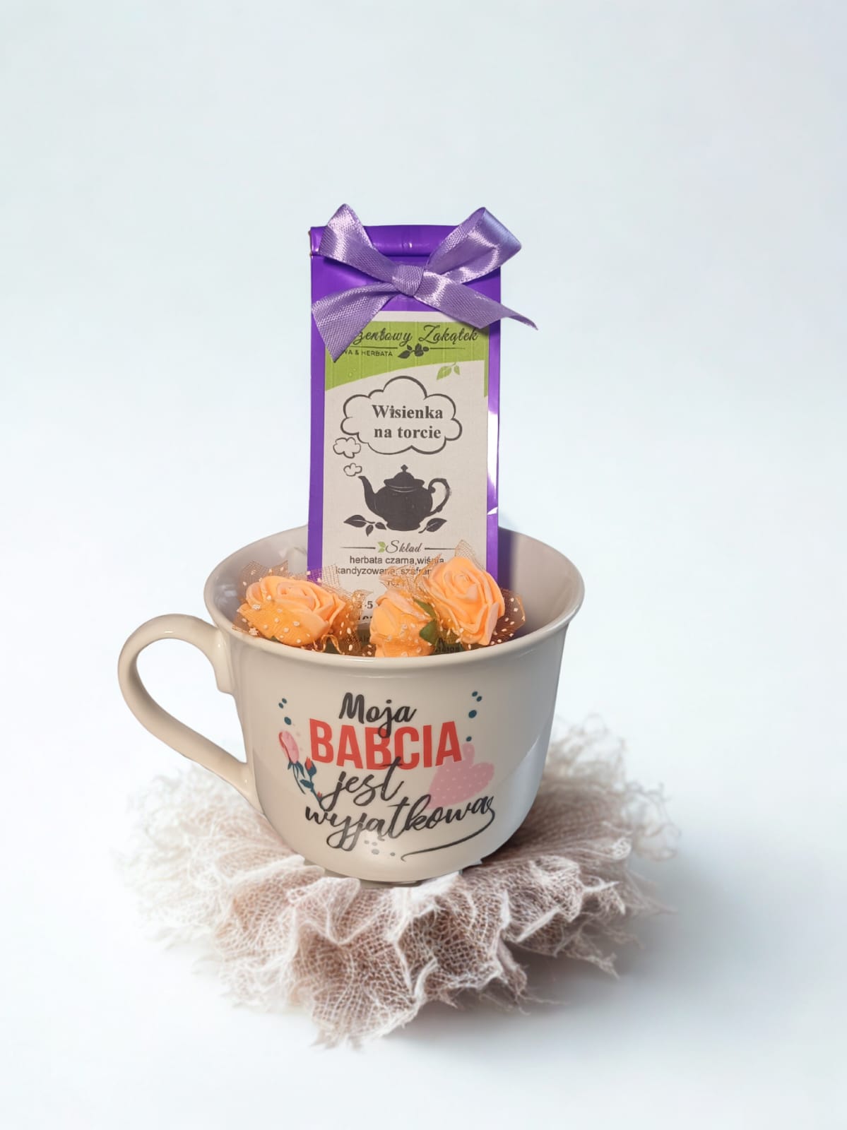 Duża filiżanka dedykowana babci z aromatyczną herbatą. Prezent gotowy do wręczenia, z kwiatowymi dekoracjami