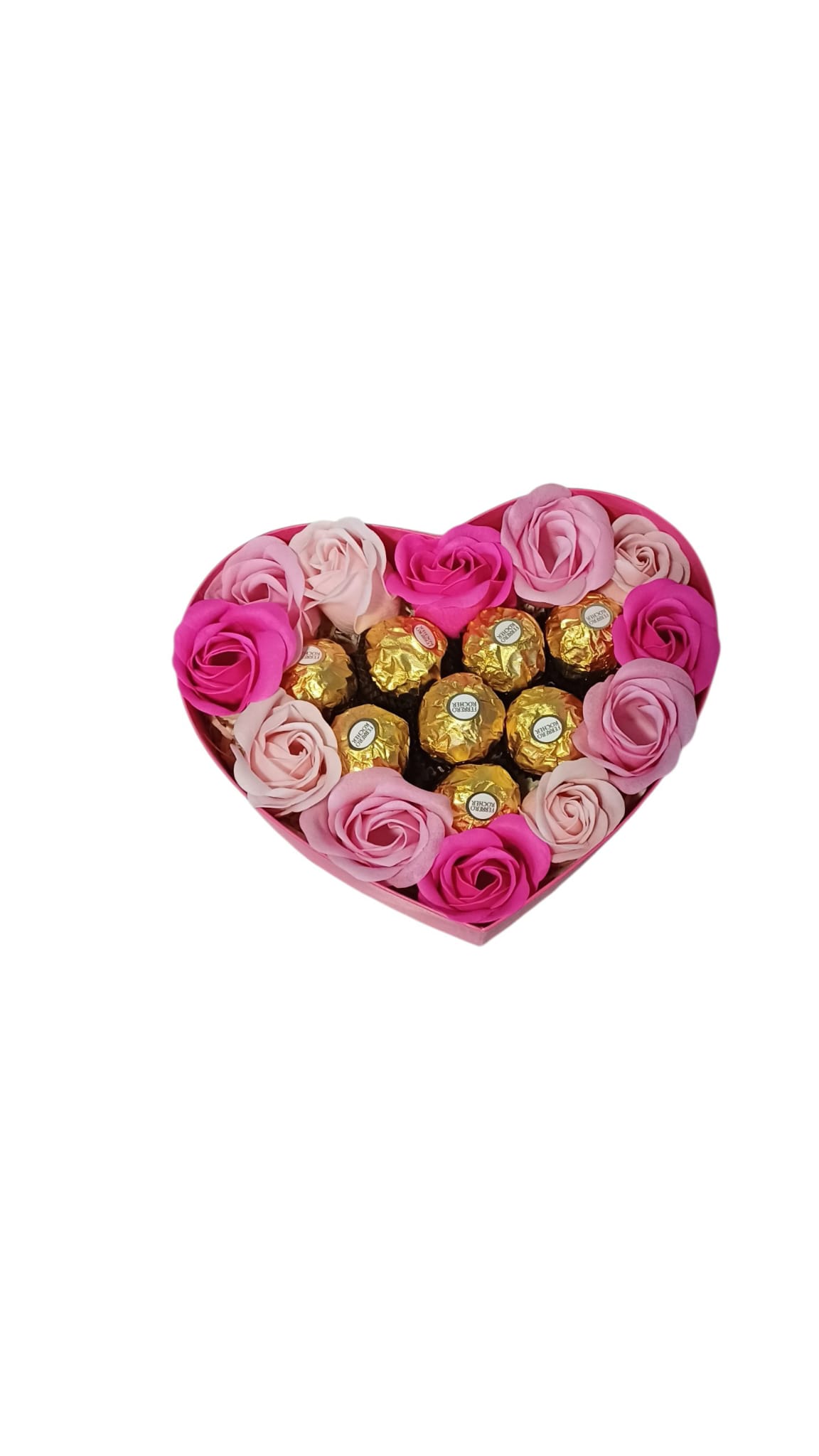 Gotowy prezent z różami mydlanymi oraz Ferrero Roche, zamknięte w pudełku w kształcie serca